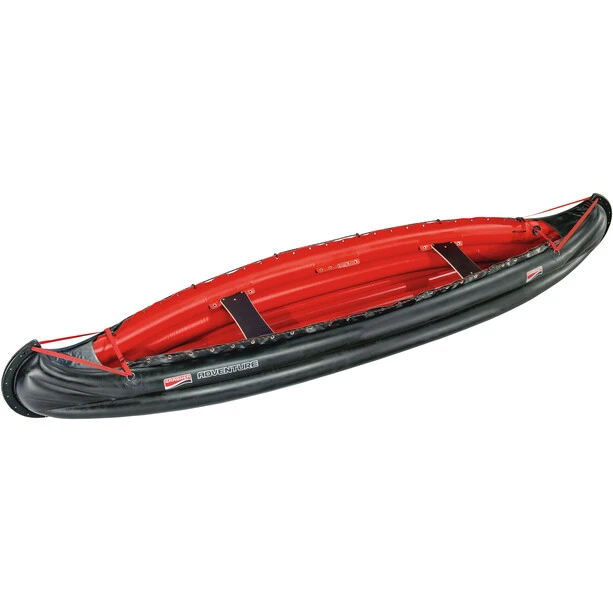 The seats (x) can be mounted as horizontal planks or, with the help of the belts, set to any angle. The boat can be trimmed by adjusting the seat board along the length. The large luggage storage area provides space for even the most extensive adventure equipment. The spraydeck (x) protects against rain, spray and cold, as well as permitting luggage to be fastened down at the bow, stern and middle. The ideal colour scheme has been well thought out. The black outer skin (particularly tough and resistant thanks to the high percentage of soot) blends discretely into the surroundings). The red inner skin can save your life as a signalling colour in an emergency. With its three seat holes, the Adventure Expedition can be used by 3 persons or the ideal seat position for two persons can be selected.