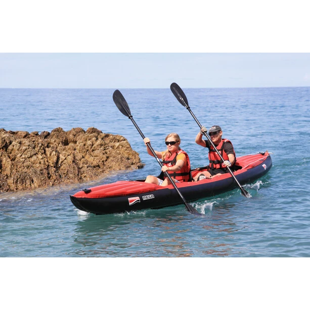 New super comfortable travel kayak for 1 or 2 adults or 2 adults + 1 toddler. Smooth running due to long stretch, unbeatable tipping stability due to large width. The comfortable seats with high backrest are infinitely adjustable in length and inclination. Even heavier people feel comfortable and safe in the Mega. For comfortable paddling on rivers, lakes, the sea and up to white water 3. Ideal for propulsion with electric motor.