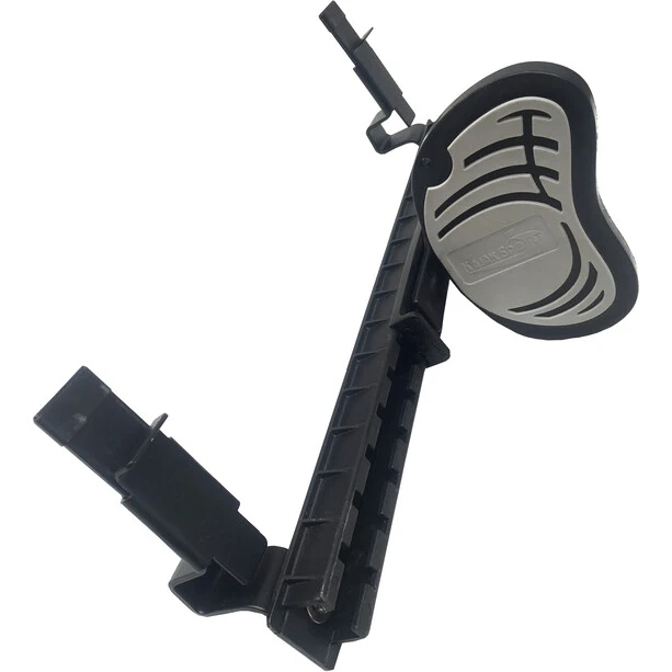 Flexibly mounted footrest gradually adjustable to individual leg length, can be combined with control system incl. rails for attachment.